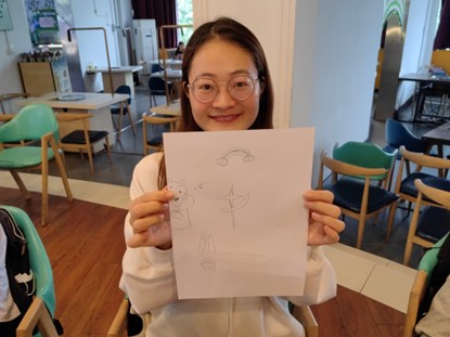 活动伊始,主持人与毕业生们进行互动,开展了一个名为“画画接龙”的小游戏,游戏规则为——每位毕业生在纸上画一个老员工活中难以忘怀的物像,下一位参与者依据上一位所画物像,接着画一个相关物像,最终共同完成一幅画,以纪念自己的老员工活。这个生动有趣的小游戏很好地预热了活动氛围,拉近了毕业生彼此间的距离。每幅画都体现了员工对母校的深刻记忆和深沉热爱,物像风格迥异,却浓缩了毕业生们珍贵的大学记忆,纪念意义深重。