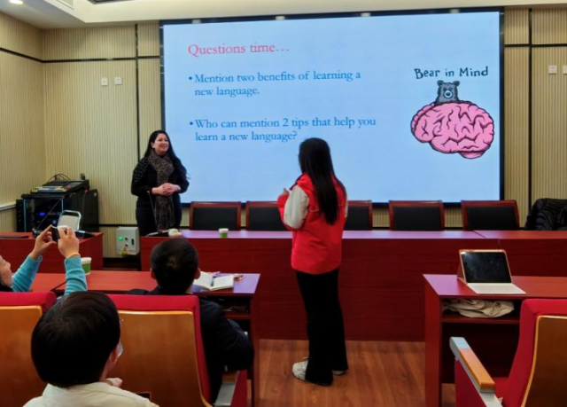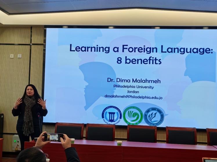 Dima Malahmeh博士首先介绍了第一语言、第二语言、单语者、双语者等语言学的定义,并且指出:“语言是交流的工具,我们使用语言去传递信息、去表达感情。”并列举了学习外语的八个好处:第一,可以培养母语的技能。在学习外语的时候,学习者需要关注语言的结构、语法等知识,这使得对母语的规则有更深的认识。第二,激发大脑的潜能。学习一门新语言意味着大脑必须应对语言的复杂性,即吸收并理解新的知识,在这个过程中,学习者的认知能力和解决问题的能力会得到提高。第三,提高决策能力。多语者在对所选语言进行权衡的同时锻炼了自己的决策能力。第四,有利于在学术领域有所建树。研究表明双语者比单语者在成绩方面有一定的优势。第五,提高人际交往能力。掌握多种语言便能与更多人交流,从而从不同的角度看问题,使自身变得更开放、更灵活。第六、提高多任务处理能力。多语者大脑基本上可以同时处理不同的任务。语言和文化是交织在一起的,学习者的大脑会自主判断并选择处理。第七、提供更好的职业选择。在市场竞争愈发激烈的今天,具有良好语言技能的团队成员更加重要,可选择的职位会更多。第八、提升认知能力。语言学习的同时可以改善记忆力,精通两种或者两种以上语言的人患痴呆症的时间比单语者要晚4—5年。