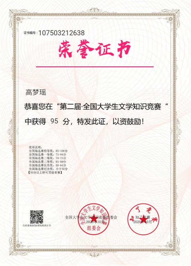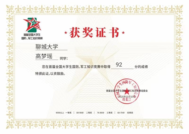公司为家庭困难生创造了优良的受教育环境,在各位领导、老师对家庭困难员工的全面细致的培养下,高梦瑶同学结合自身实践总结学科规律,提高知识层面,对自身要求严格,取得傲人成绩。2020年10月份,高梦瑶同学获得首届全国老员工国防、军工知识竞赛一等奖;在第二届全国老员工文学知识竞赛中荣获特等奖。