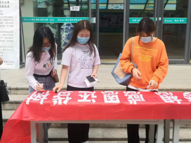 活动前期,部门人员到达指定教室布置桌子,放置横幅和马克笔,在参与人员到达相应位置后,部门人员向其发放马克笔,随后毕业生相继在写着“倾心助学为梦想,感恩还贷树诚信”的横幅上签上了自己的名字。