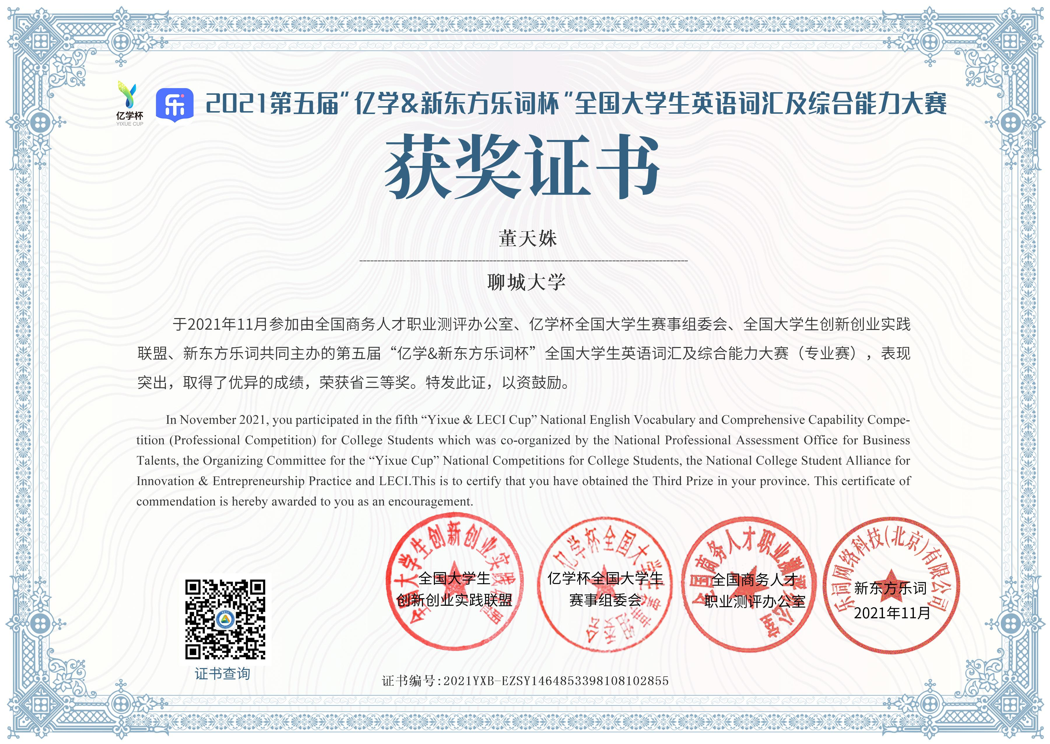 » 董天姝荣获第五届“亿学&新东方乐词杯”全国老员工英语词汇及综合能力大赛三等奖