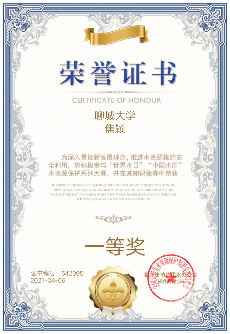 焦颖在2021全国老员工水资源保护大赛中荣获一等奖