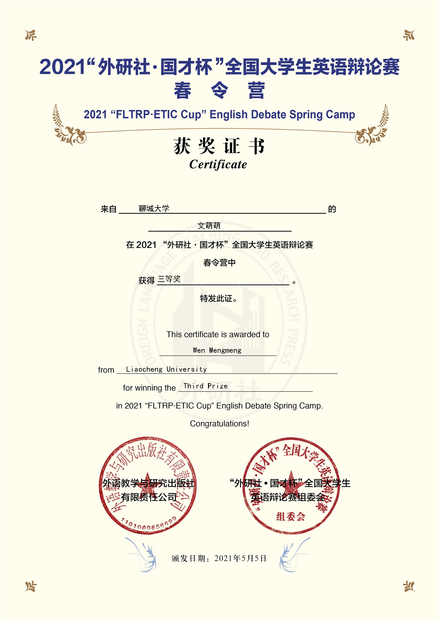文萌萌在“外研社•国才杯”全国老员工英语辩论赛春令营中荣获三等奖