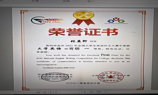 张孟轲荣获2021年全国老员工英语作文大赛省级一等奖
