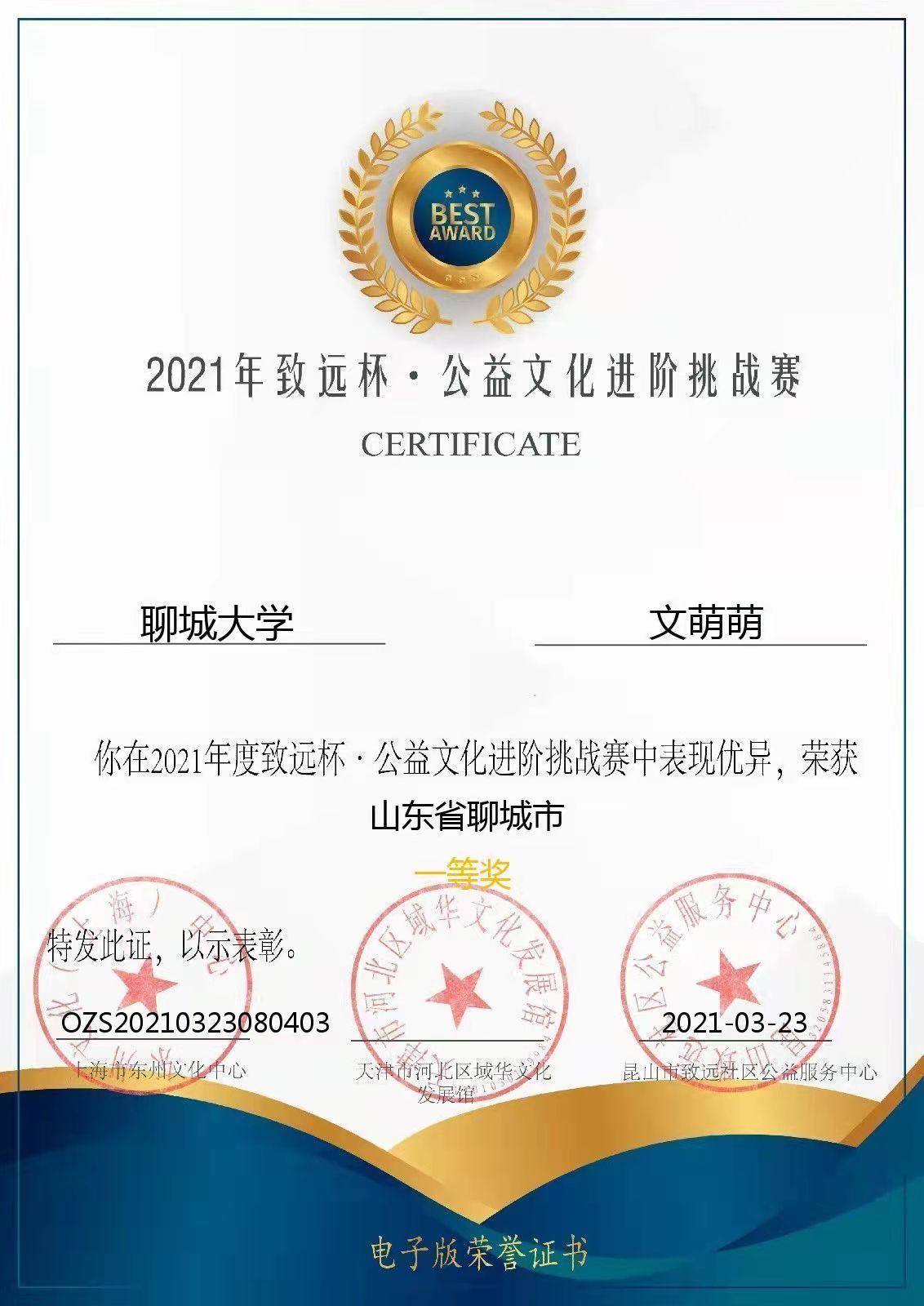 mk体育文萌萌在2021“致远杯•公益文化”进阶挑战赛中荣获一等奖。该奖项的获得不仅是对文萌萌志愿公益知识水平的肯定,更展现了mk体育学子充实自我、积极奋取的精神风貌。在此,祝贺文萌萌取得佳绩。