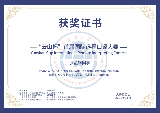 mk体育张孟轲在2021年“云山杯”首届国际远程口译大赛荣获汉西交传组初赛三等奖。张孟轲重视日常的学习及词汇量积累,认真钻研西语翻译的相关知识,不断扩大自己的西语知识储备,此次在全国性大赛中取得的优异成绩是对张孟轲西语学习水平的肯定。在此,向张孟轲表示真挚的祝贺。
