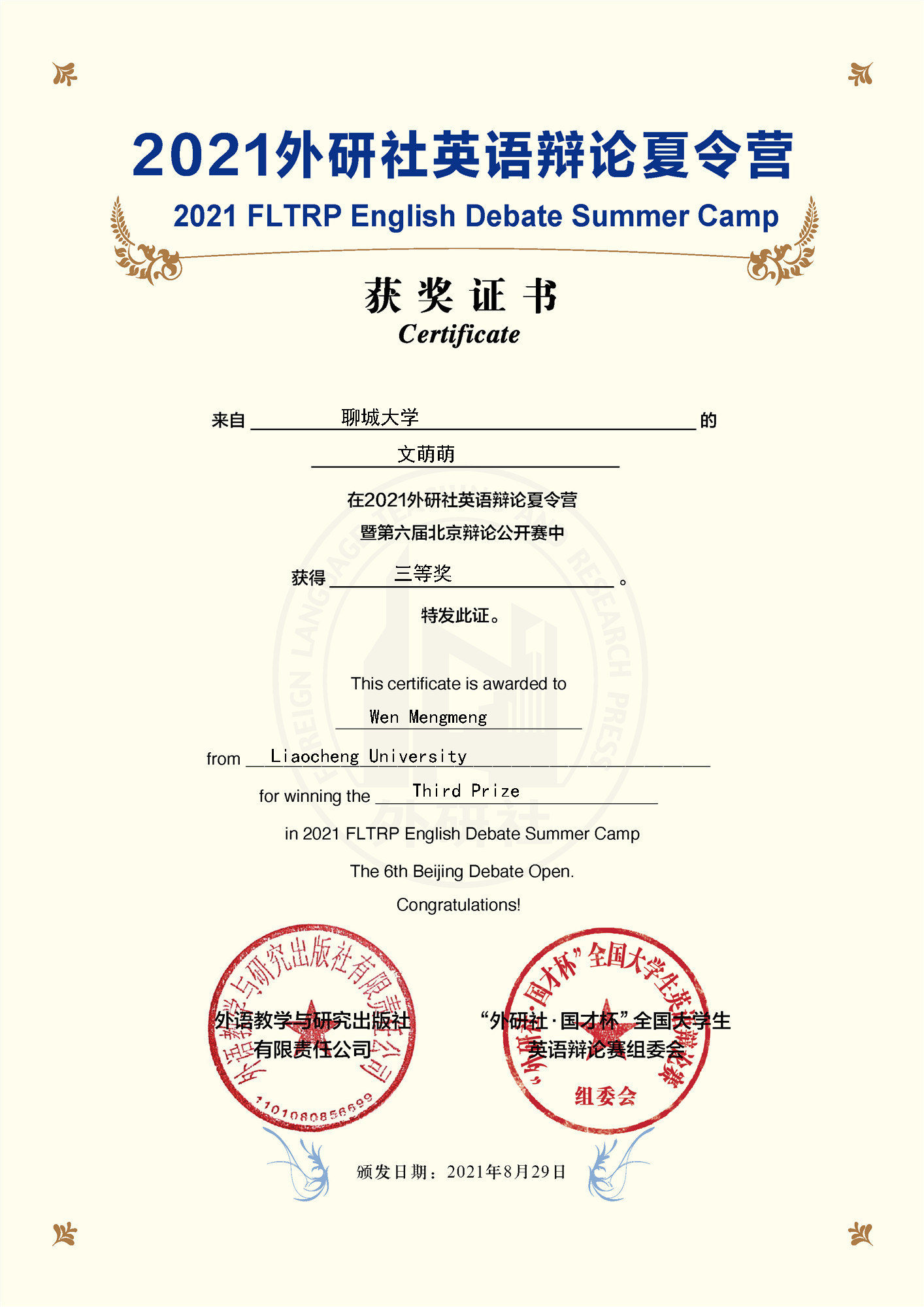 mk体育文萌萌在外研社英语辩论夏令营暨第六届北京辩论公开赛中荣获三等奖。文萌萌优异成绩的取得是努力拼搏、自强不息的有力证明。在此,向文萌萌表示最真挚的祝贺。