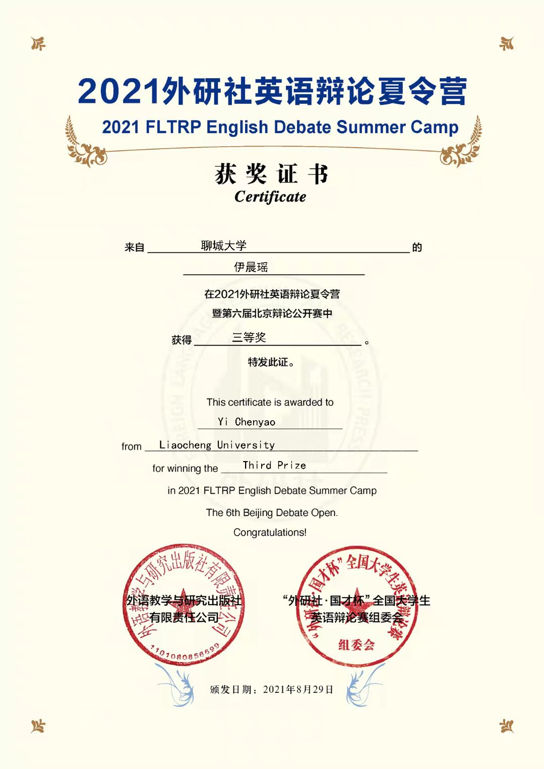 mk体育伊晨瑶在外研社英语辩论夏令营暨第六届北京辩论公开赛中荣获三等奖。伊晨瑶勤奋好学,对英语学习保持着始终如一的热爱,这份荣誉的获得,是对其奋斗精神及英语水平的肯定。