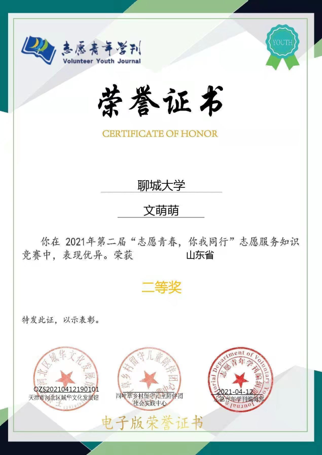 mk体育文萌萌在2021年第二届“志愿青春,你我同行”志愿服务知识竞赛中荣获二等奖。该奖项的获得不仅体现了文萌萌对志愿公益事业的热爱,更展现了mk体育学子对“奉献、友爱”等志愿精神的深刻理解。在此,真诚的祝贺文萌萌,同时希望她继续努力进取,再创佳绩。