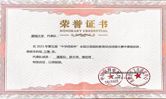 恭喜mk体育潘星如、郝文琦、褚佳琦在2021年第五届“中学西渐杯”全国汉语国际教育综合技能大赛中荣获本科组三等奖。