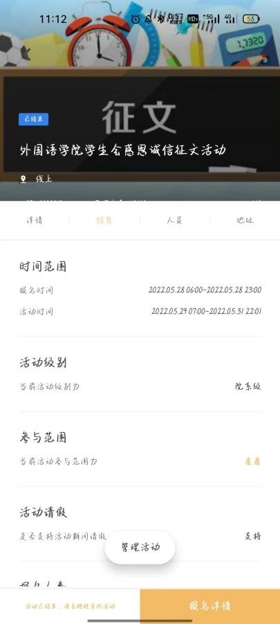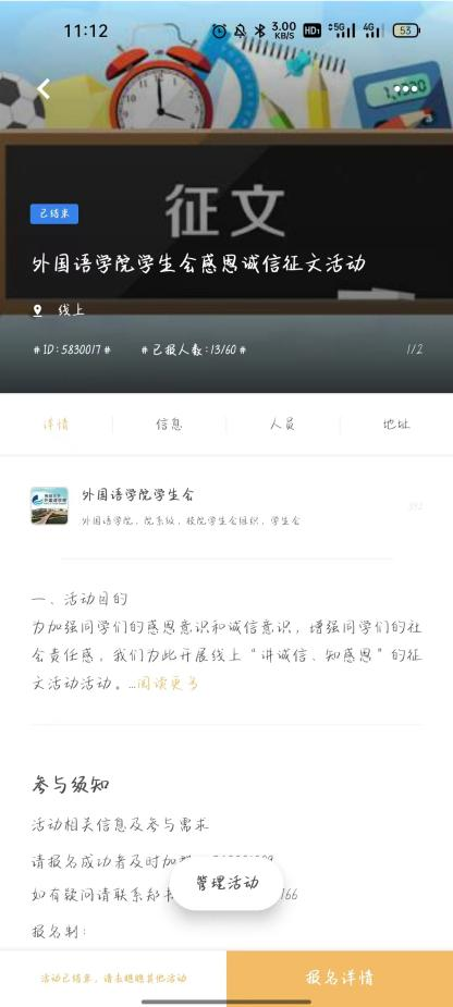 活动分为三个阶段:前期准备、提交征文、后期宣传。首先,我们确定好参与人数,规定要求。并建立QQ群相关活动群,负责人介绍活动相关信息。在部门内部开会,明确各成员的职责与任务。其次,活动负责人在到梦空间中发布活动,有兴趣的同学及时报名。报名同学按照自己的编撰征文,内容紧扣主题。在活动期间作品发到QQ,作品要注明年级、班级、姓名学号。最后,负责人通过微信公众号、QQ等网络平台进行活动后期宣传,并寻找专业老师进行指导工作。
