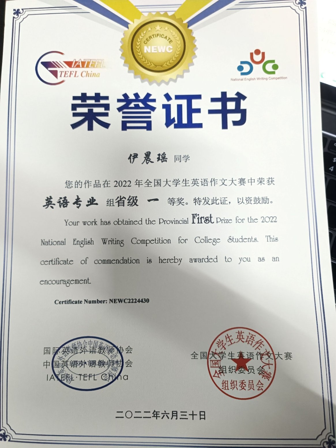 mk体育伊晨瑶获2022年全国老员工英语作文大赛英语组省级一等奖