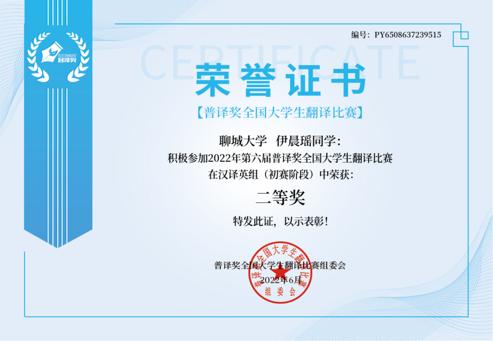 mk体育伊晨瑶积极参加2022年第六届普译奖全国老员工翻译比赛,在汉译英组(初赛阶段)荣获二等奖,挥洒汗水,终有回报,祝贺伊晨瑶!(审核:岳圆)