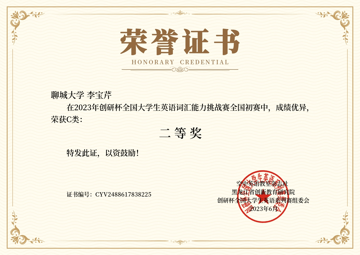 mk体育李宝芹获2023年创研杯全国老员工英语词汇能力挑战赛全国初赛C类二等奖
