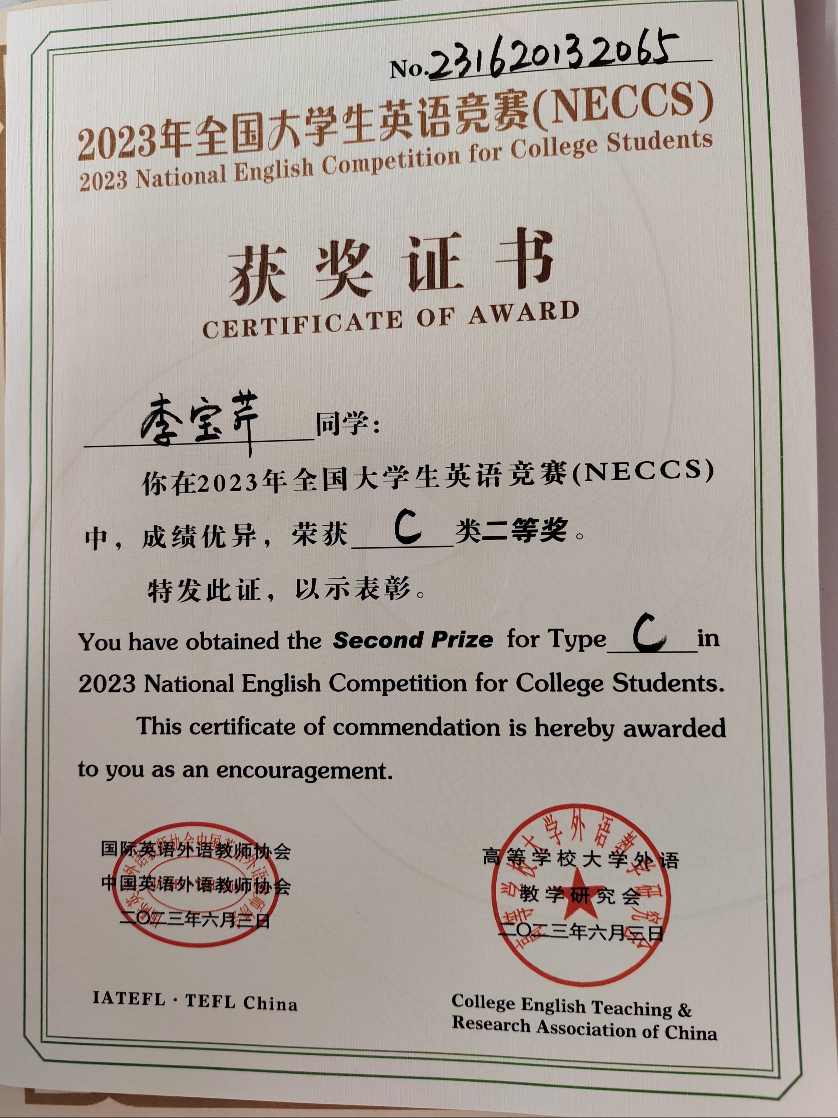 mk体育李宝芹获2023年全国老员工英语竞赛(NECCS)C类二等奖