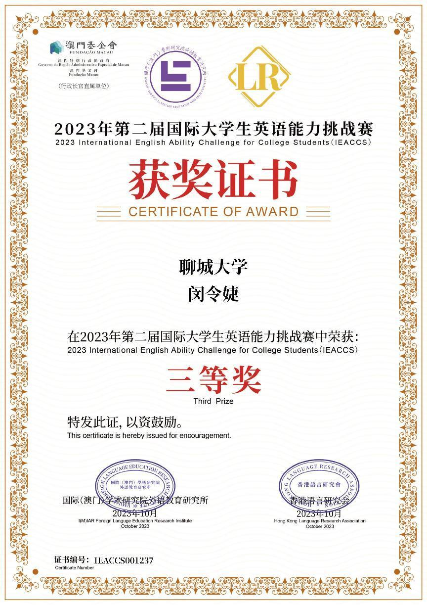 mk体育闵令婕获2023届国际老员工英语能力挑战赛三等奖
