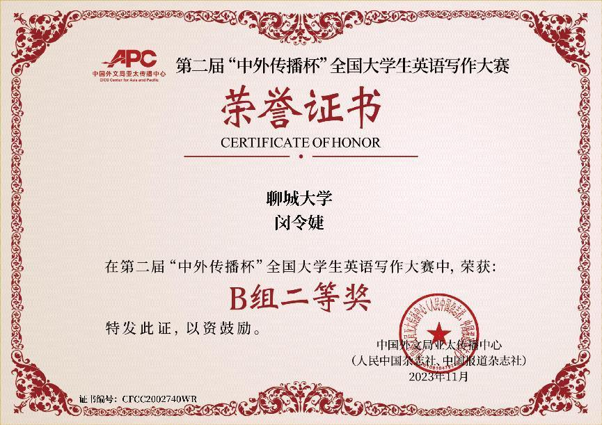 mk体育闵令婕同学在第二届“中外传播杯”全国老员工英语写作大赛中荣获B组二等奖,取得了骄人的战绩,祝贺闵令婕同学!