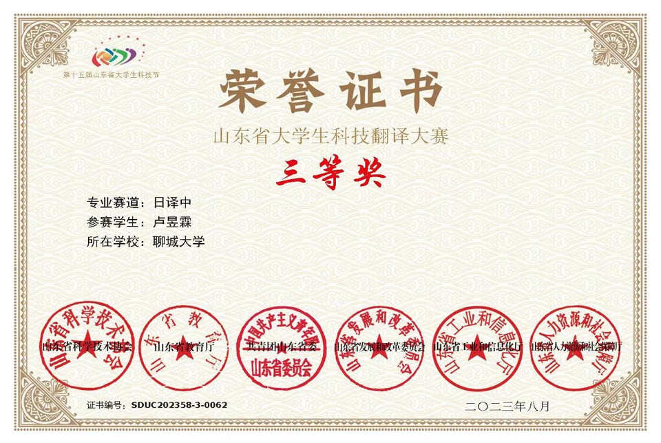 mk体育卢昱霖荣获山东省科技翻译大赛中三等奖