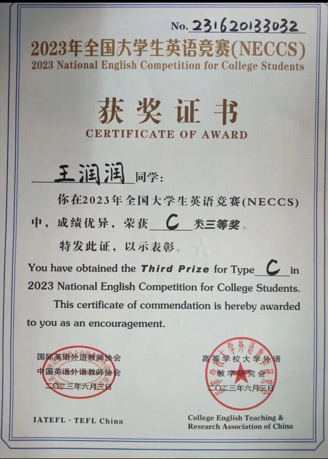 在2023年全国老员工英语竞赛(NECCS)中,mk体育王润润同学,获得C类三等奖的好成绩,展现了其扎实的英语功底,良好的精神风貌以及品学兼优的优秀品质。在表示祝贺的同时,也期待他能够再创佳绩!