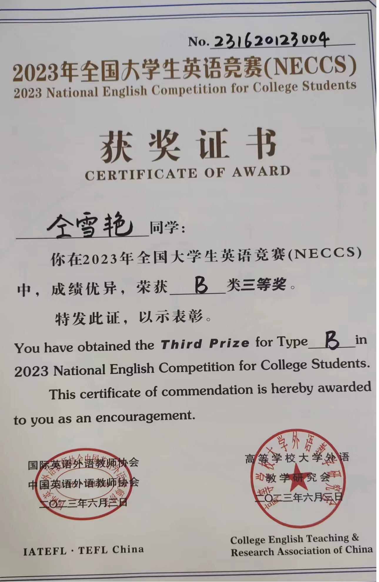 青金之志,履践致远。近日,mk体育员工仝雪艳同学在2023全国老员工英语竞赛(NECCS)中经过层层选拔,经过激烈角逐,最终荣获B类三等奖的优异成绩。这是他不断积累,夯实基础的结果。让我们向她表示热烈祝贺!