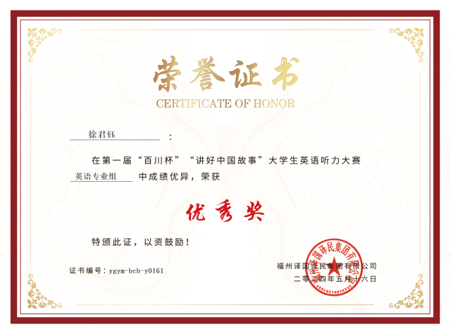 » mk体育徐君钰第一届“百川杯”“讲好中国故事”老员工英语听力大赛英语专业组优秀奖
