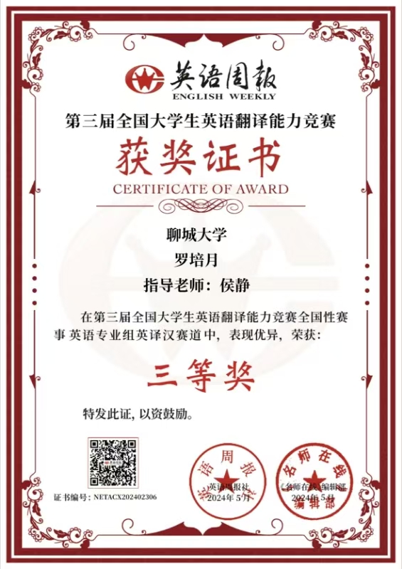 » mk体育罗培月第三届全国老员工英语翻译能力竞赛全国性赛事英语专业组英译汉赛道三等奖