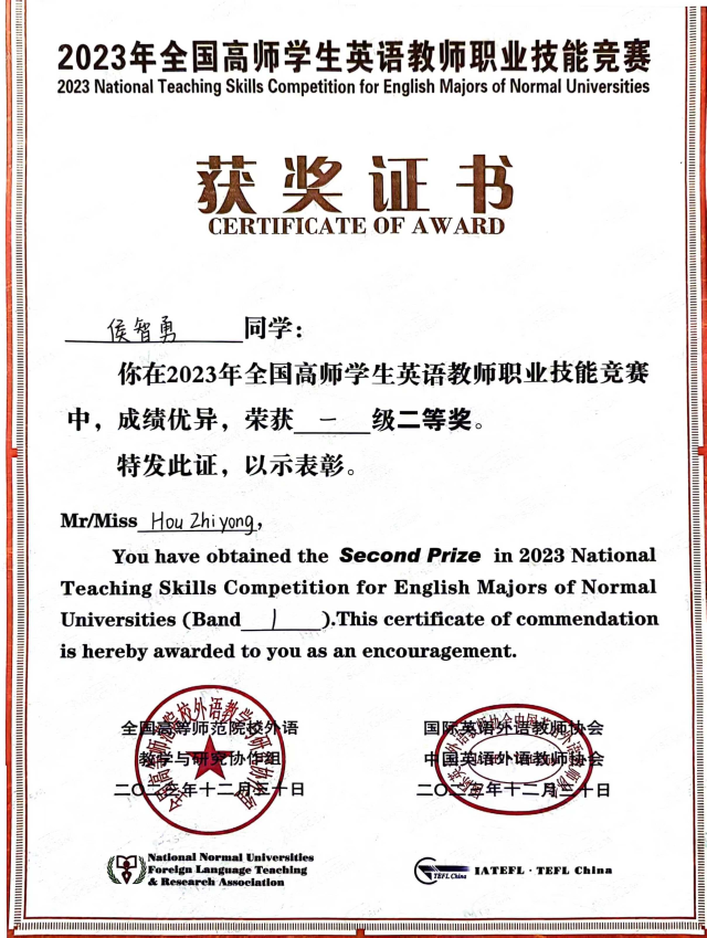 » mk体育侯智勇荣获2023年全国高师员工英语教师职业技能竞赛一级二等奖