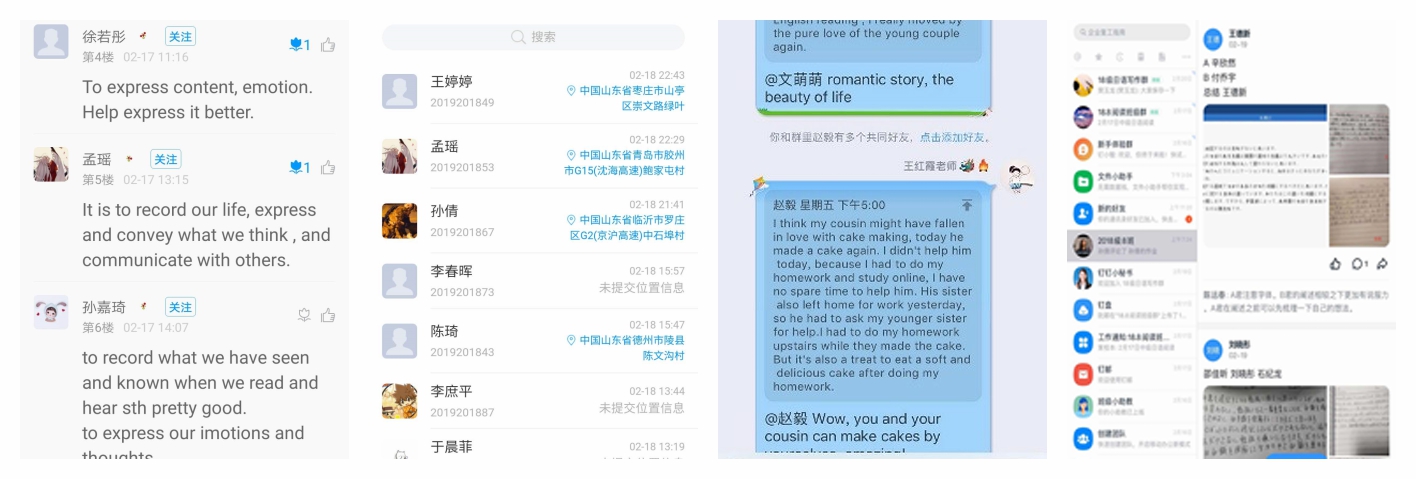 同学们的参与度增加了,英语系19级郝文琦同学说:网课转变了师生互动的方式,平时上课不敢或者不好意思回答问题的同学也积极到参与其中,屏幕冰冷但心却很温暖。”