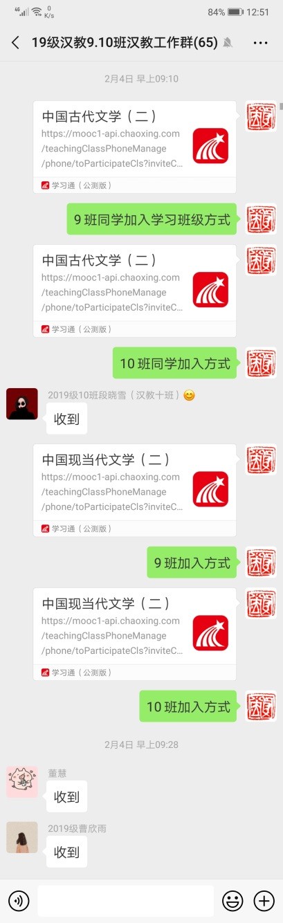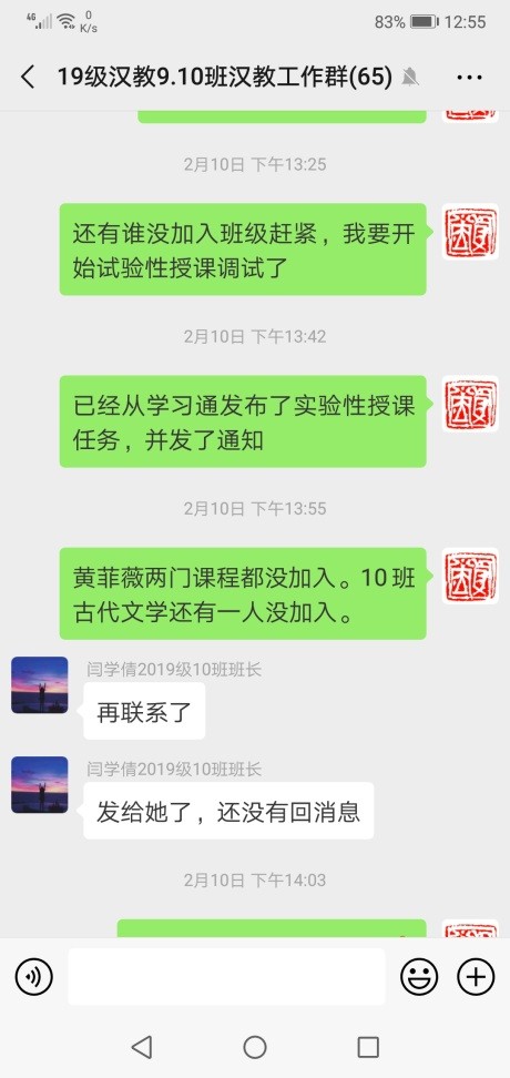 从2月1日开始,通过mkmksport网络教学平台接入的超星学习通端口提供的在线教学相关技术性内容进行跟踪式学习、培训,我逐渐掌握了利用学习通开展在线教学的基本流程与技术性内容,并提前以《中国现当代文学(二)》在线授课界面内容为例,联系相关员工先期组建班级,进行了在线教学所涉及的具体流程、内容的预演性调试,并从员工端获取了相关效果的具体认知。