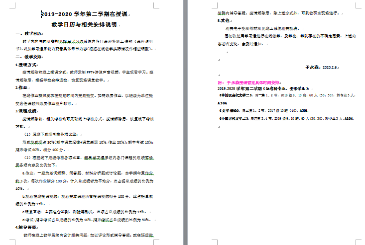 (2020年2月6日制定的我的在线教学教学日历及相关情况说明)