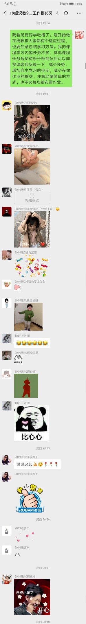 在线教学开始后,师生之间均有一个适应的过程,尤其是员工,针对网络拥堵、学习任务过多、辗转于多个网络平台学习等现实情况,需要一个适用和心理调适的过程,并及时调整学习方法、策略与具体安排。处理不好上述问题,有的员工到朋友圈吐槽。对此情况,我及时进行了关切式回应,调查了自己的授课在员工端呈现的在线压力情况,虽然获知我的课程任务并不过量,但我还是在相关员工群内进行了情绪安抚,并提醒其他授课教师注意员工端学习任务的适量,引起了相关老师的协同合作,效果良好。
