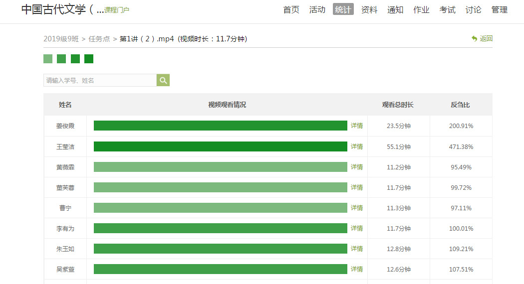 (超星学习通内因系统问题导致相关课程的员工多次观看视频情况的数据呈现,其中有员工反复观看5次)