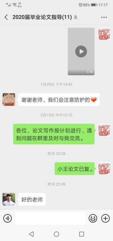 在正式课程进行在线教学的同时,其他工作如本科毕业论文指导工作也同时进行。我在分配指导任务后就建立了专门微信群,此时所负责的2020届本科毕业论文指导工作正在有序、按时进行中。目前,已经有1人提交初稿,1.2万字左右,我进行了具体指导,给出了具体指导意见、建议。
