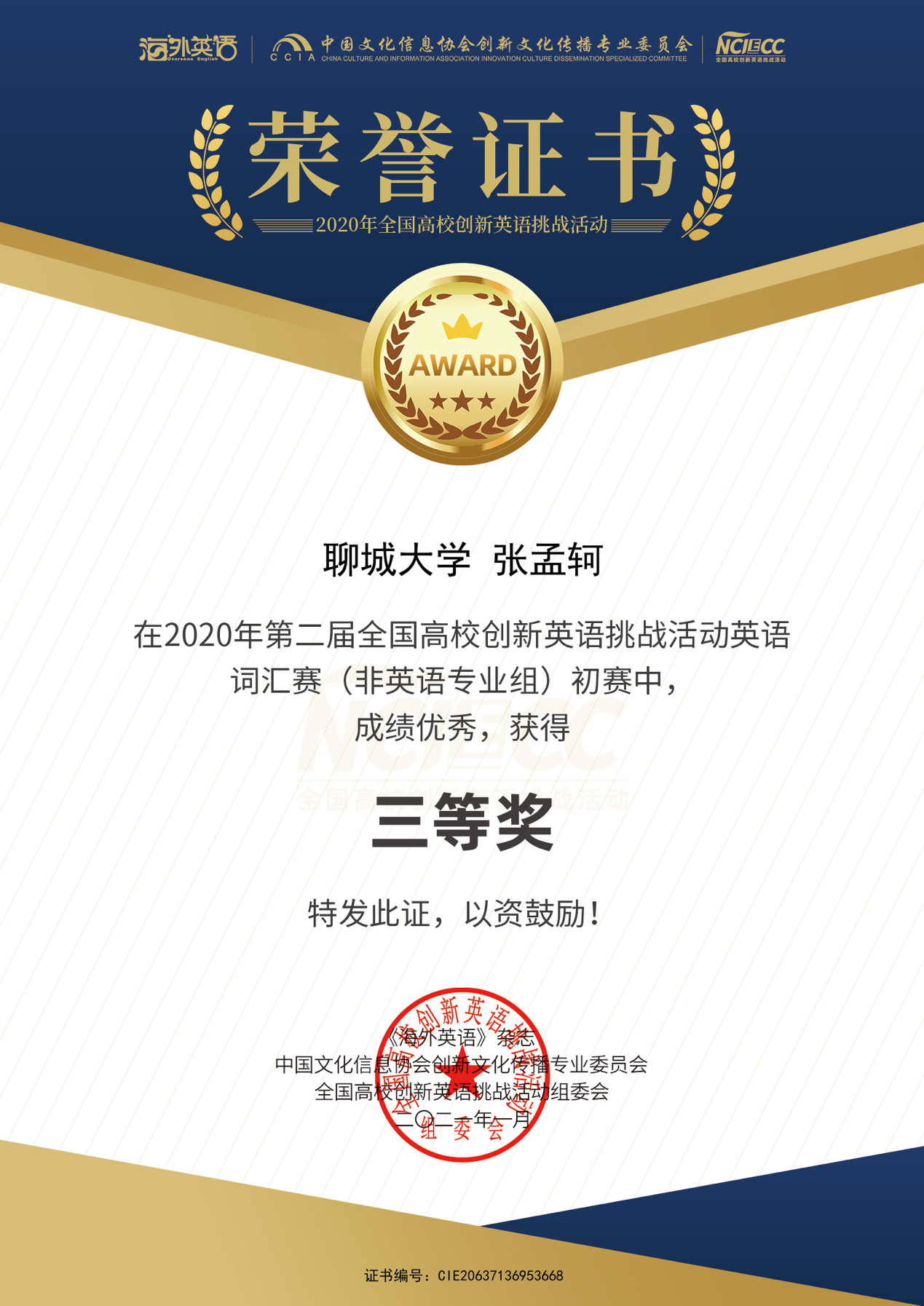 » 张孟轲在第二届全国高校创新英语挑战活动英语词汇赛国家级初赛中荣获三等奖