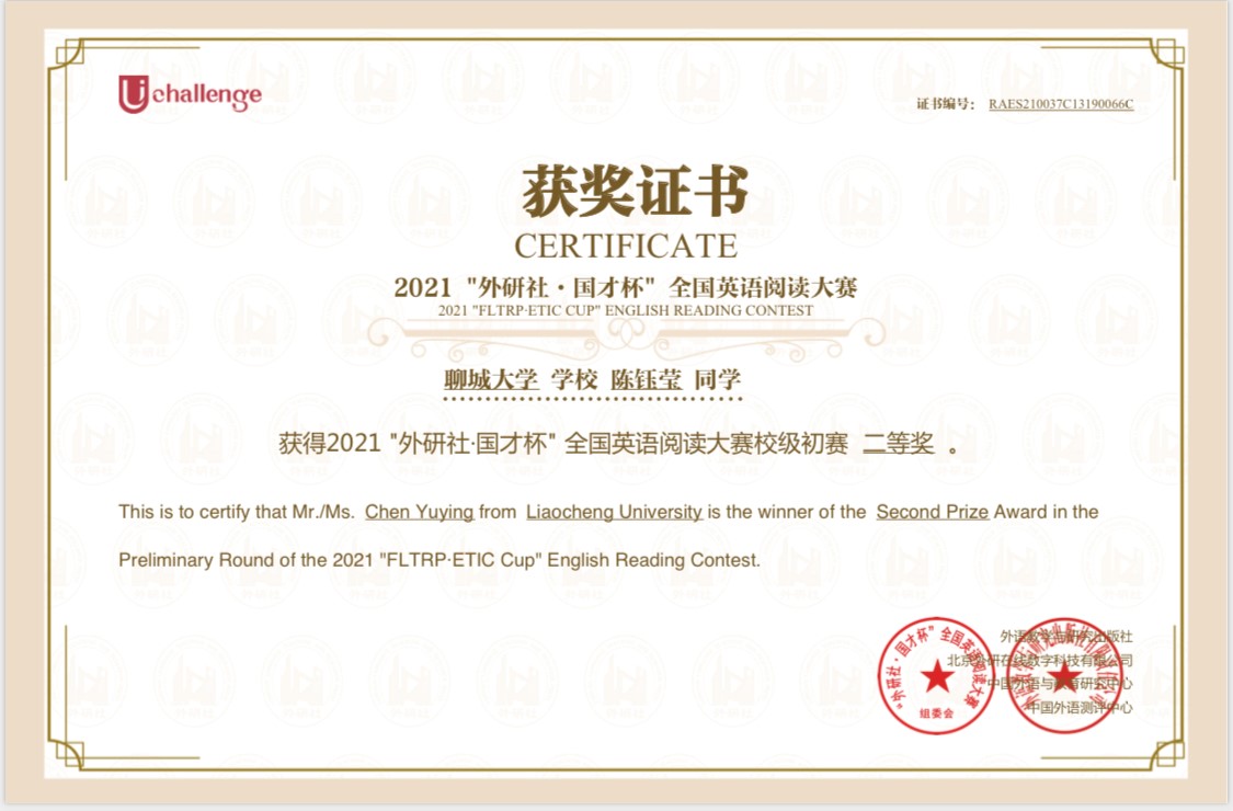 » mk体育员工陈钰莹在2021“外研社·国才杯”全国英语阅读大赛校级初赛中荣获二等奖