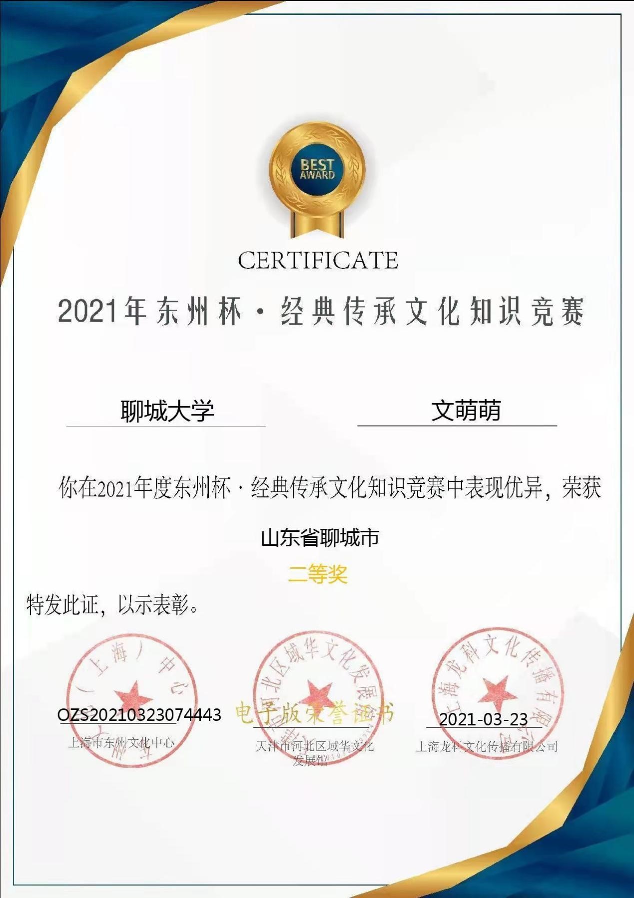 mk体育员工文萌萌在2021年度东洲杯·经典传承文化知识竞赛中荣获山东省聊城市二等奖,对中国经典的浓厚兴趣使文萌萌在日常生活中注重文化积累,此份荣誉也见证了她的努力和成长。真诚的祝贺文萌萌!