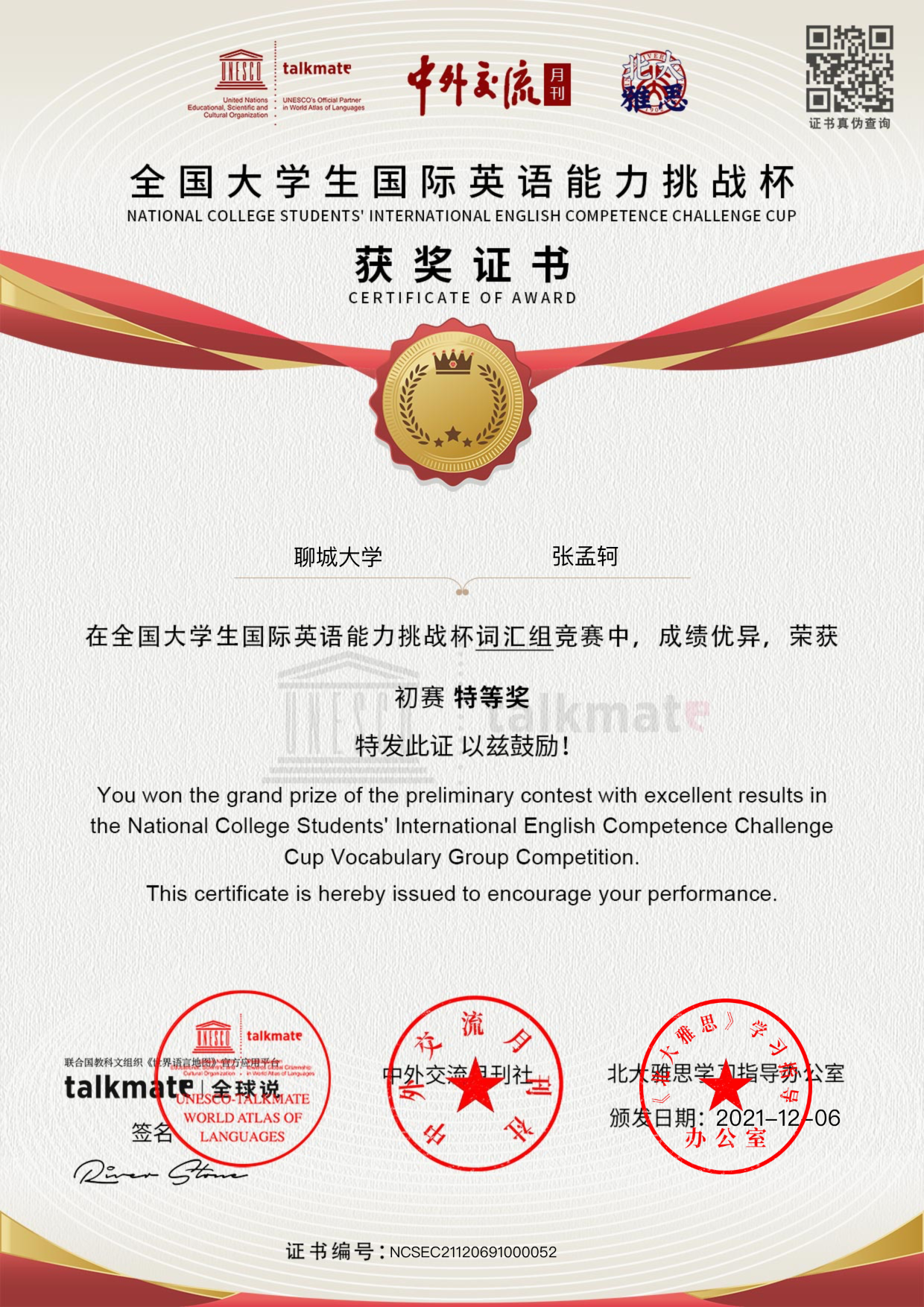 mk体育张孟轲在全国老员工国际英语能力挑战杯(词汇组)中荣获初赛特等奖,特等奖的取得,离不开张孟轲长期付出的努力,在此,向张孟轲表示最诚挚的祝贺!