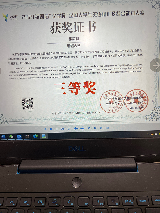 » mk体育张孟轲在第四届“亿学杯”全国老员工英语词汇及综合能力大赛中荣获三等奖