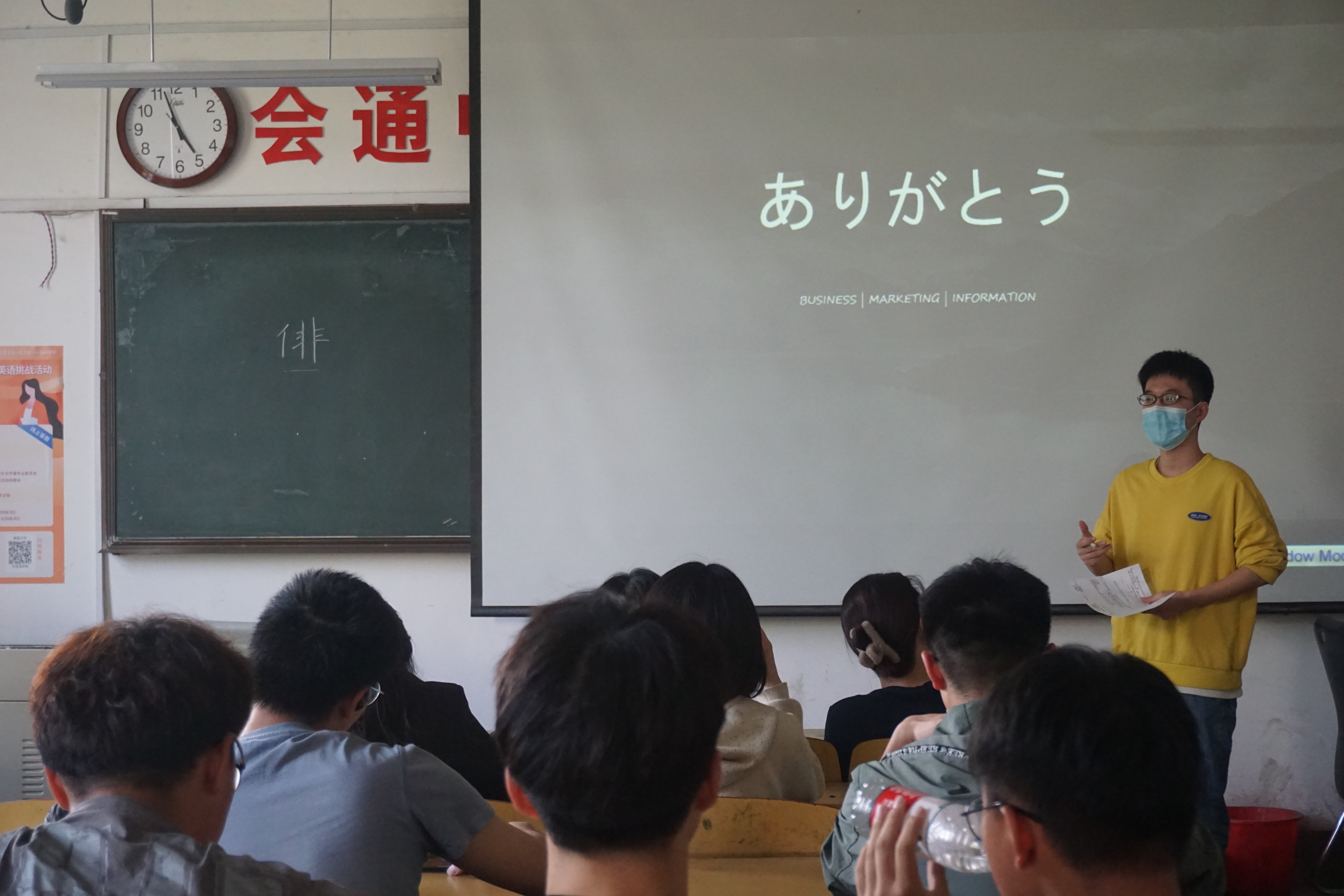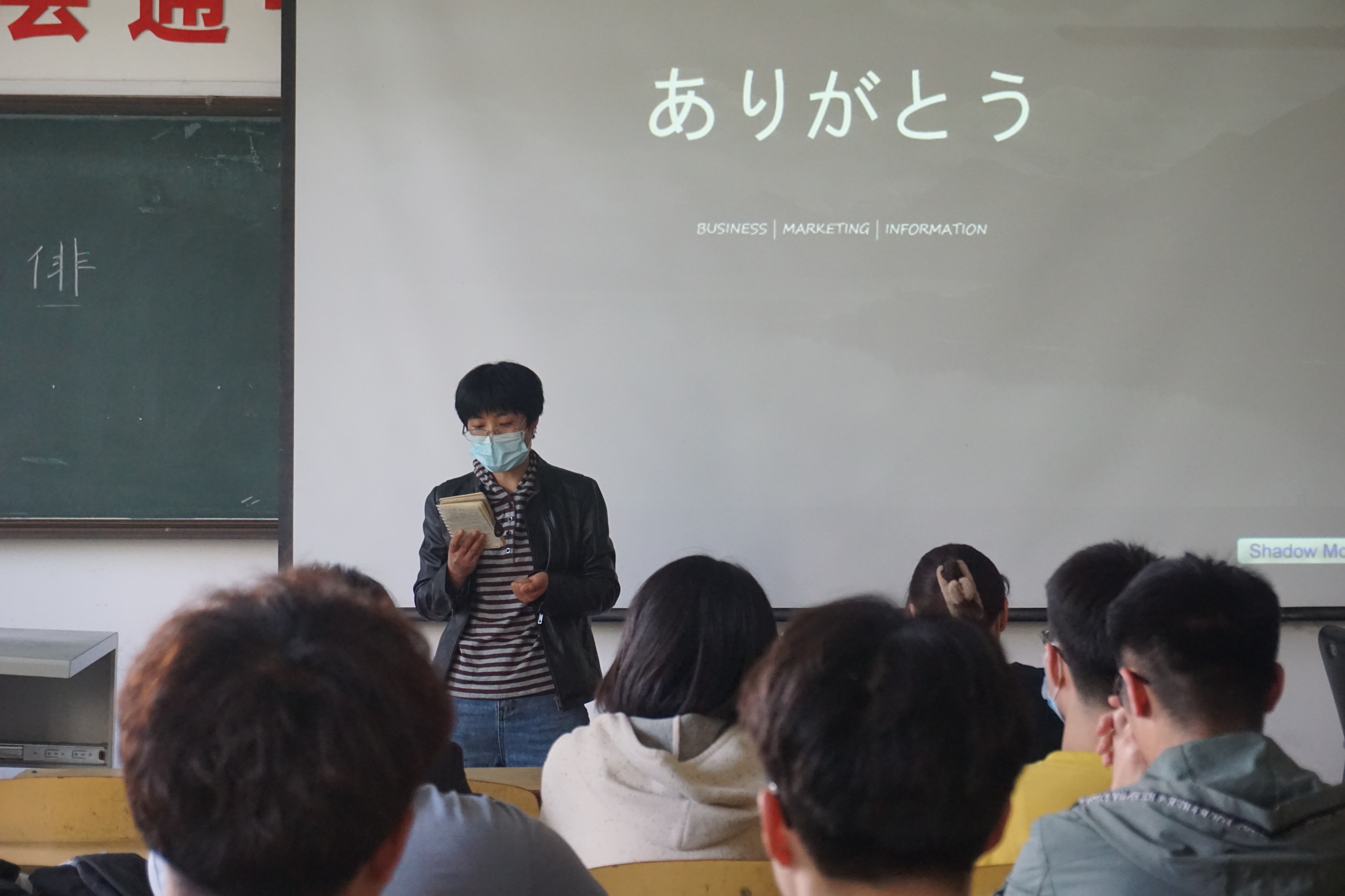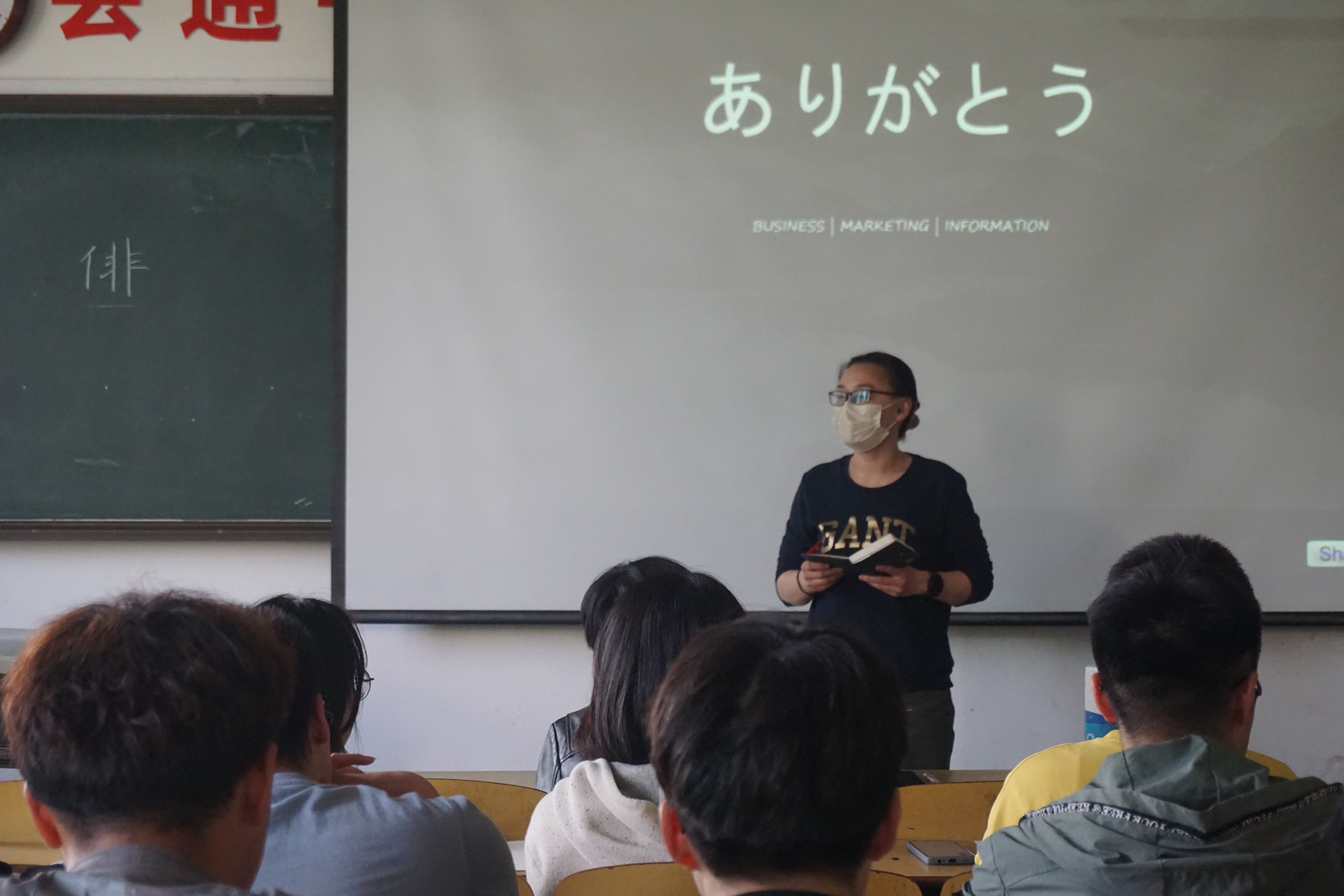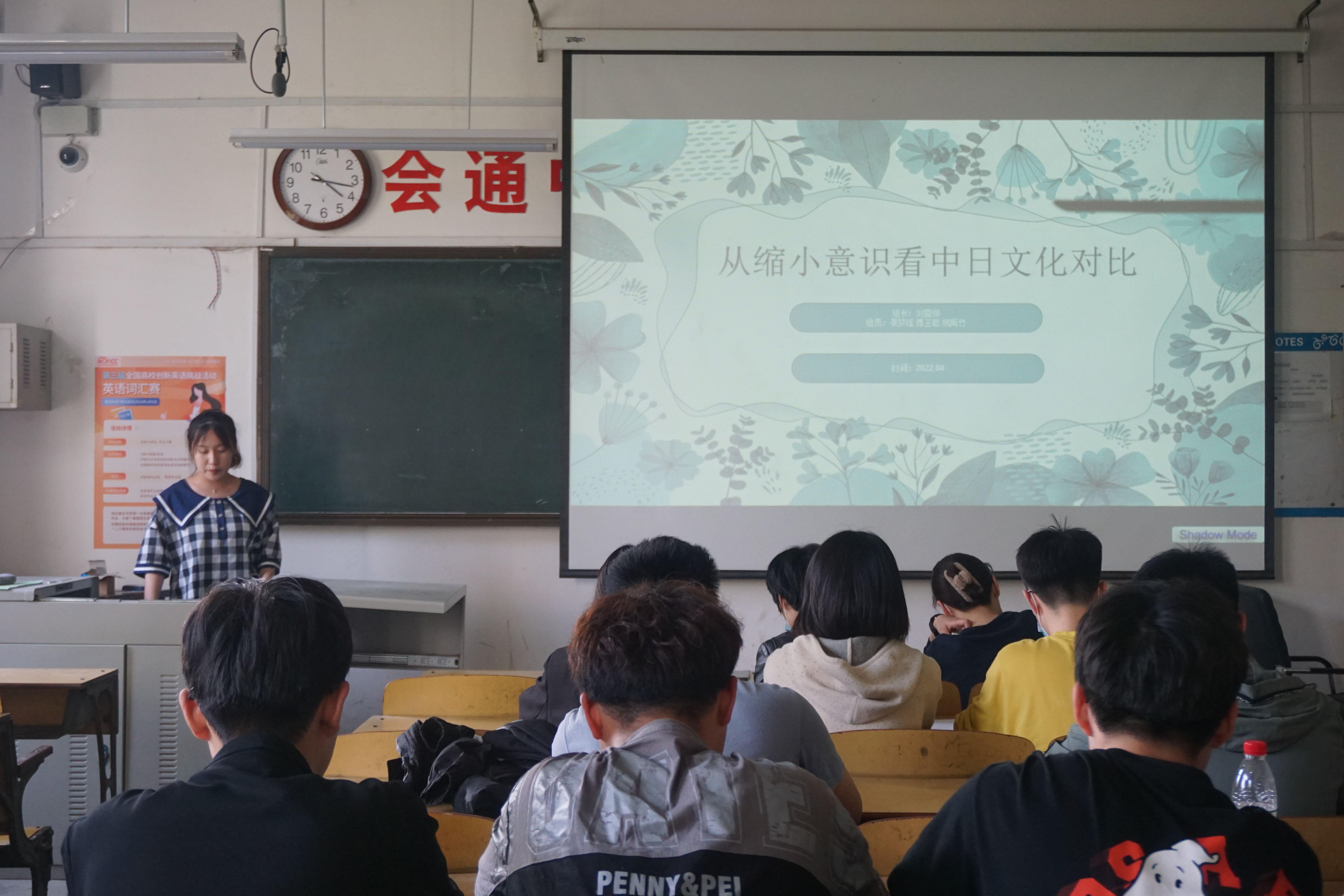 活动主要通过老师指定中文阅读书目(《日本人的缩小意识》)、分配思考问题,各小组用PPT分享阅读成果的形式展开。本次交流会由四个组的代表上台分享本组成果,评委进行打分及评价。四个组分别针对《日本人的缩小意识》反映的“缩小意识的表现类型及表现内容”、“从缩小意识看中日文化对比”、“日本人缩小意识的形成原因及影响”、“从缩小意识看日本人的心理结构”展开了交流分享。演讲者通过精彩的演讲,得到了评委及老师的肯定。评委代表与同学们各抒己见,切磋见解,现场氛围甚是浓烈。教师们也对本次读书会活动进行总结,同时鼓励同学们积极阅读,拓宽视野。最后,二组成员在主题内容、仪表仪态、语言表达、多媒体制作、小组配合、临场反应五方面获得综合评分第一名。