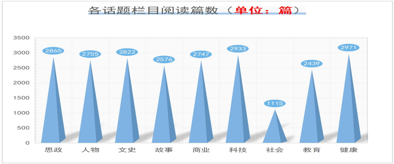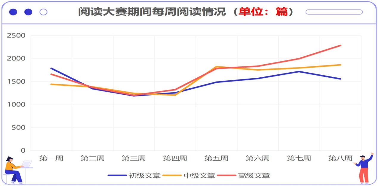历时八周的比赛结束后,《2022年mkmksport春季思博乐学杯英语阅读大赛数据报告》于2022年6月8日公布,全校有1258名员工参加了阅读比赛,根据评奖标准,有30名来自不同公司不同专业的员工分别获得一、二、三等奖。参赛员工阅读的文章涵盖了社会、科技、教育、文史、经济等类别,获奖员工每周的阅读量达到3200余篇,比赛过程中所有员工阅读高难度文章的数量呈上升趋势。