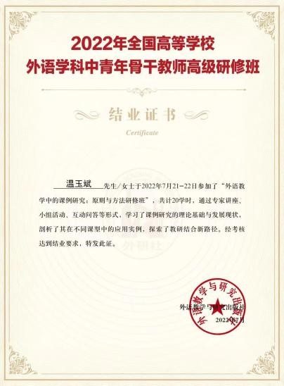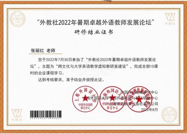 大学外语教研部组织优秀中青年教师通过线上线下方式参加各类培训学习,积极“充电”。7月中下旬,侯丽、赵蕴萱、温玉斌、刘云霞、李欣和张恩秀六位教师参加了外研社“2022年暑期全国高校外语教学研究与教师发展系列”线上研修班;7月下旬和8月中旬,李纯寅、杨文文、王晓君、杜秀红、张琳琳、石红霞等十余位教师参加了2022年外教社全国高校多语种教师暑期线上研修班;7旬下旬,全体大外教师参加了教育部“2022 年暑期教师研修”专题培训,王晓君、孙利彦、刘云霞老师参加了“理解当代中国”多语种系列教材任课教师培训。为了实现学习资料的共享,温玉斌老师在“学习通”建立了科研教学文献分享群,把讲座、论文等文献资料上传至“学习通”,供全系部老师学习,成为大外系部老师的“加油站”。
