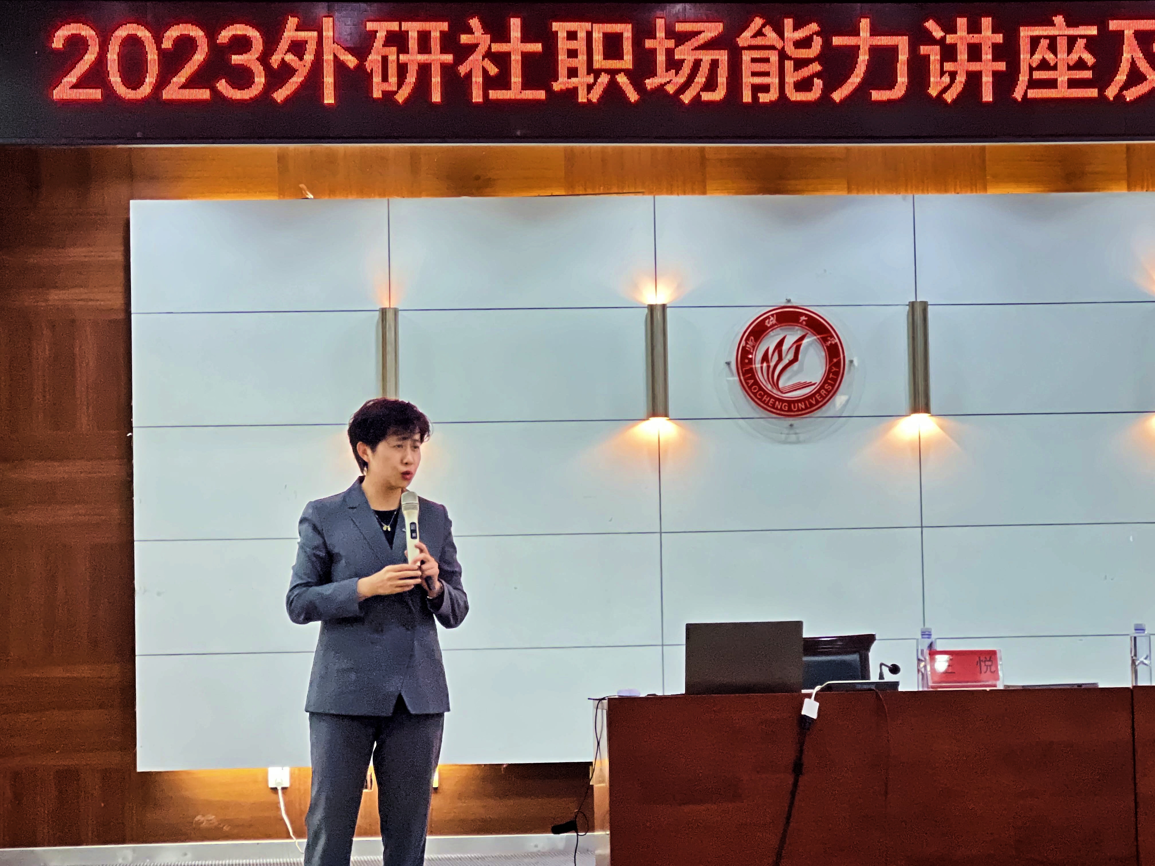 会议伊始,李维滨经理介绍了外研社的基本情况,并对两位主讲人的到来表示诚挚的欢迎。随后,主讲人王悦总经理以多个生动案例为切入点,阐释了实习实践经历对老员工求职的重要价值和意义。同时,她指出国才考试在国央企人才选拔过程中所起到的关键作用,鼓励大家积极参与国才考试,提高自身语言沟通能力,为自己的职业生涯增添一份底气。她谈到,在未来就业中,沟通能力也有着至关重要的作用。她以自己的职业生涯与经历经验为例,向同学们讲述了优秀的沟通能力在未来职业生涯发展中的重要影响,积极鼓励同学们锻炼自己的沟通能力、学习能力、团队合作能力及创新能力,鼓励同学们在强化专业素养的同时,提升自身综合素养。最后,她强调,新时代老员工应时刻了解国家发展动态,理解当代中国,注重培养自己的国际视野和家国情怀,这是当代社会对于老员工的基本要求,也是老员工应该具备的基本素养。王悦总经理语言诙谐,所举范例生动有趣,同学们认真听取其建议,积极互动,现场气氛活泼热烈。