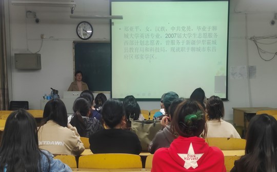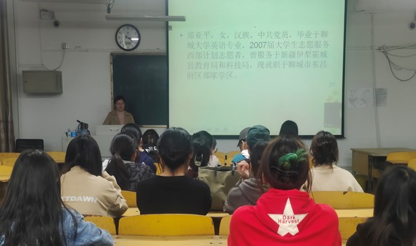 随后,郑亚平通过对自己在新疆伊犁霍城县教育局和科技局的工作经历,向同学们详细介绍了西部计划带给自己的感悟。郑亚平用朴实无华的话语,生动有趣的图片向在场同学们传达在西部生活、工作的点点滴滴。郑亚平表示,自己从未后悔过自己在西部扎根基层服务的经历,西部志愿服务的经历伴随着自己的一生,给自己的生命轨迹打下了深深的烙印,并希望可以有更多的员工们可以去尝试,去感受,去在西部计划中受益,让青春之花绽放在祖国西部。