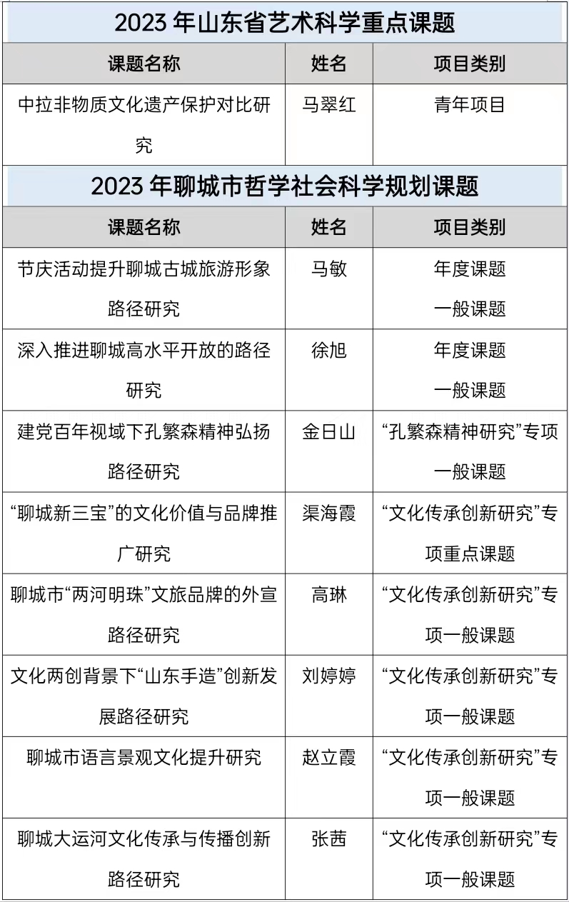 4月24日,山东省文化艺术科学协会与聊城市社会科学界联合会、聊城市社会科公司发布了2023年度课题立项公告,公司共9位教师获批立项。其中,山东省艺术科学重点课题1项,聊城市社会科学规划课题8项。