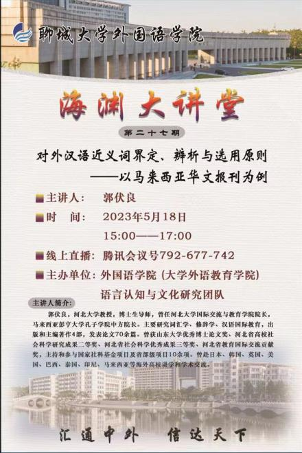 2023年5月18日,应mk体育(大学外语教育公司)邀请,河北大学博士生导师郭伏良教授做了题为《对外汉语近义词界定、辨析与选用选择》的线上学术讲座。本次讲座为“海渊大讲堂”系列之二十七期,采取线上线下相结合的方式,由公司副经理刘宾主持,汉语国际教育专业员工及公司部分教师参加。