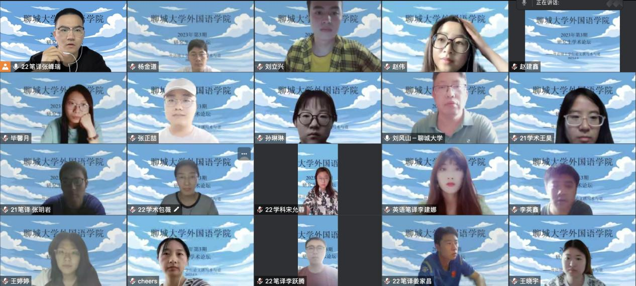 刘风山教授以学位论文撰写中需要注意的核心问题为主线,从外语学科常见学术论文类型、论文结构、论文撰写细节、文献收集与处理等方面介绍了学术论文写作的方法、套路和经验。针对学科教学(英语)、翻译硕士、外国语言文学等不同专业员工的实际需求,以《不同水平学习者对英语语调感知的实证研究》《中华民族共同体视域下的海外楹联英译研究》等5篇权威期刊论文为例,详细介绍了撰写和编写论文题目、论文摘要、文献综述、研究结论、参考文献时应该注意的事项,并分享了快速、准确寻找并应用文献资料的途径与方法。刘风山教授的讲座准确解决了本学科硕士研究生在论文撰写中遇到的问题和疑惑,起到了较好的效果。最后刘风山教授把“用心、用情、用时”作为研究生科研水平提升的法宝分享给了同学们,鼓励同学们用心挖掘研究话题,用情处理好论文撰写过程中的每一个细节,用时夯实自己的学术研究基础。