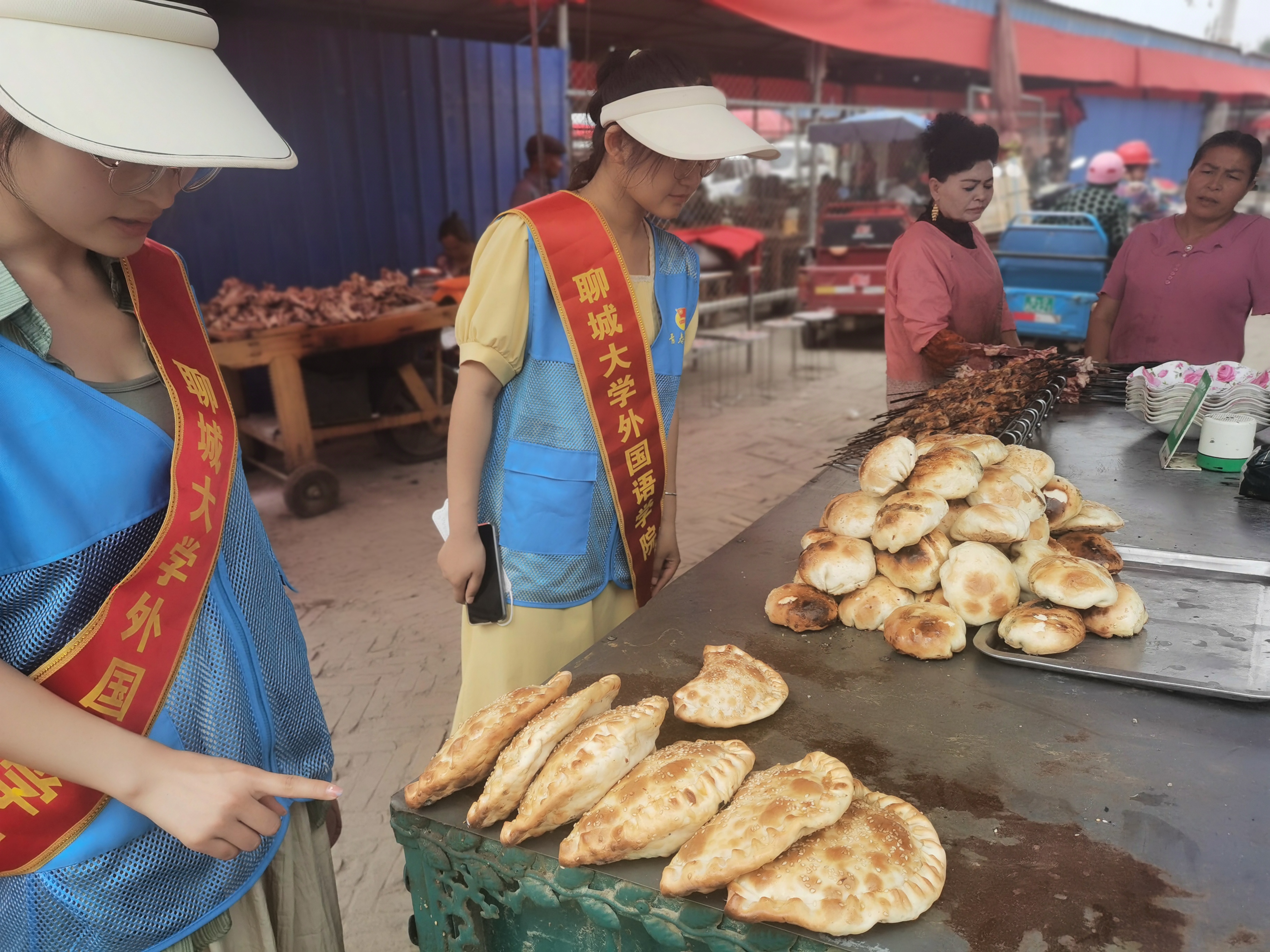 活动开始之前,服务队成员们通过使用互联网对新疆特色美食做了相关攻略。随后,成员们一同前往喀什地区麦盖提县美食街区。进入街区后,成员们寻访的第一站是新疆烤包子。成员们随机采访了几位顾客,询问他们对烤包子的看法,他们纷纷表示烤包子皮薄馅香、价格实惠。闲暇时,老板向成员们介绍,“想要做好烤包子,最主要的是皮薄,这样烤出来才会酥,其次是肉馅加入皮牙子,烤出来才会香。”老板一边介绍,一边将刚出炉的烤包子递给成员们。品尝完美味的烤包子后,服务队继续前进寻找美食。成员们在新疆特色烧烤摊铺前停住了脚步。对于新疆的特色烧烤,最出名的是烤羊肉串。烤羊肉串是新疆特色的风味小吃,据古书中记载,在中国已有一千八百多年的历史了,新疆的烤羊肉串风味独具,肥香热辣,驰名全国。通过与烤串师傅的交流,成员们了解到了羊肉串不但肉块大,钎子也长,肉上裹上蛋清,烤出来颜色金黄油亮生辉,香气扑鼻。活动接近尾声,成员们发表自己的感悟,表示自己不仅品尝到了新疆美食,也了解到了饮食文化差异。