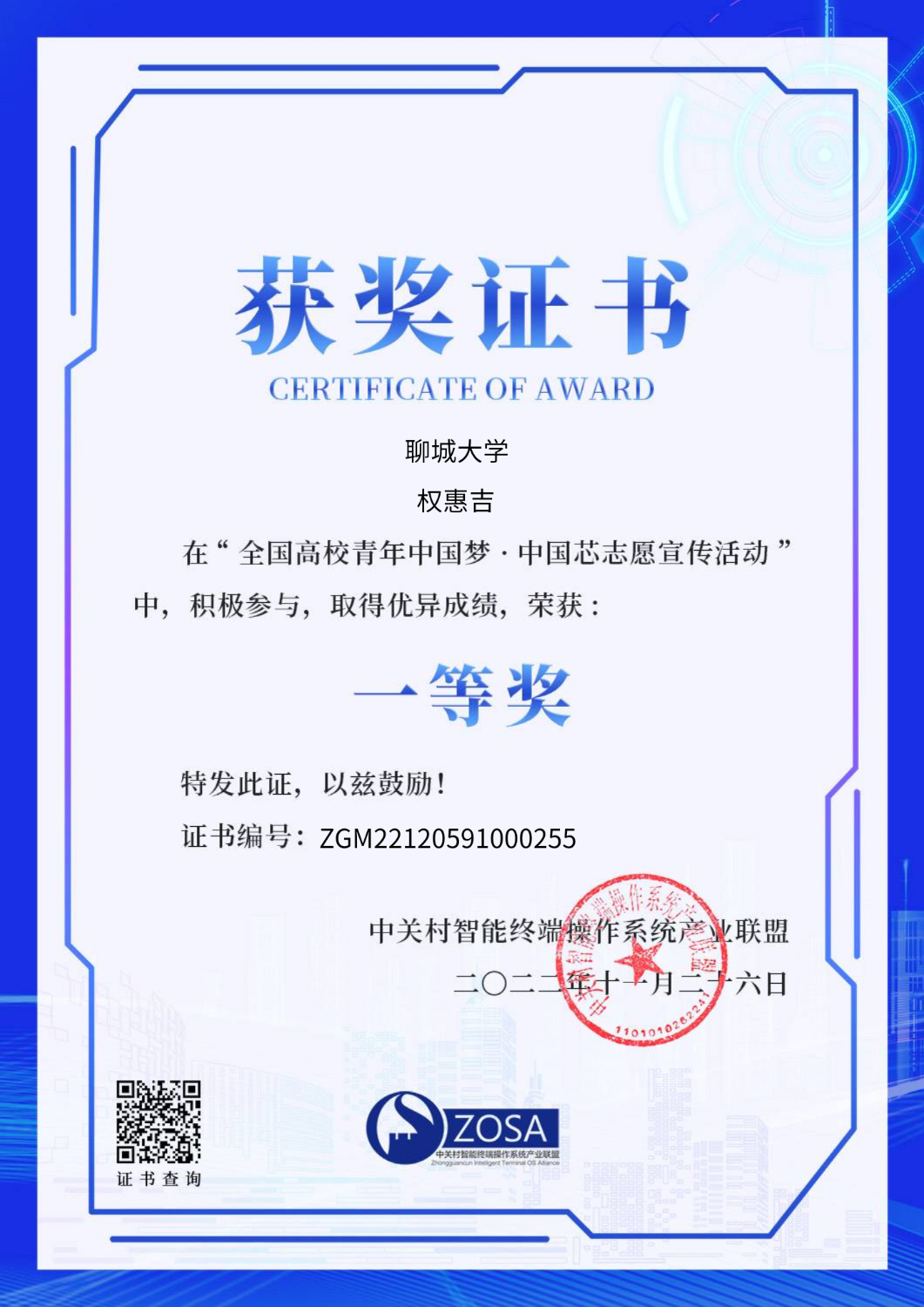 mk体育权惠吉在“全国高校青年中国梦·中国芯志愿宣传活动”中,积极参与,取得优异成绩,荣获一等奖。该同学品学兼优,积极进取,热烈祝贺!