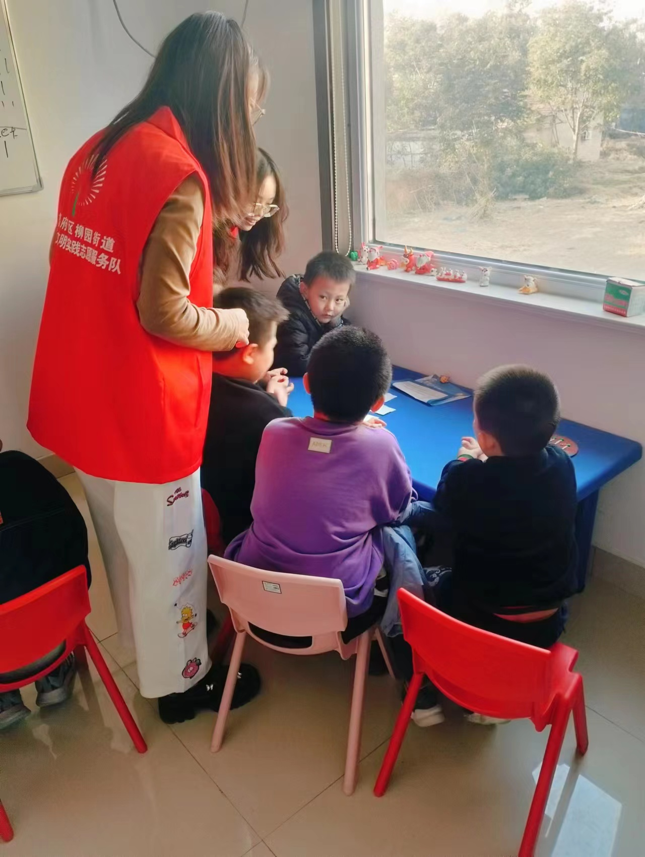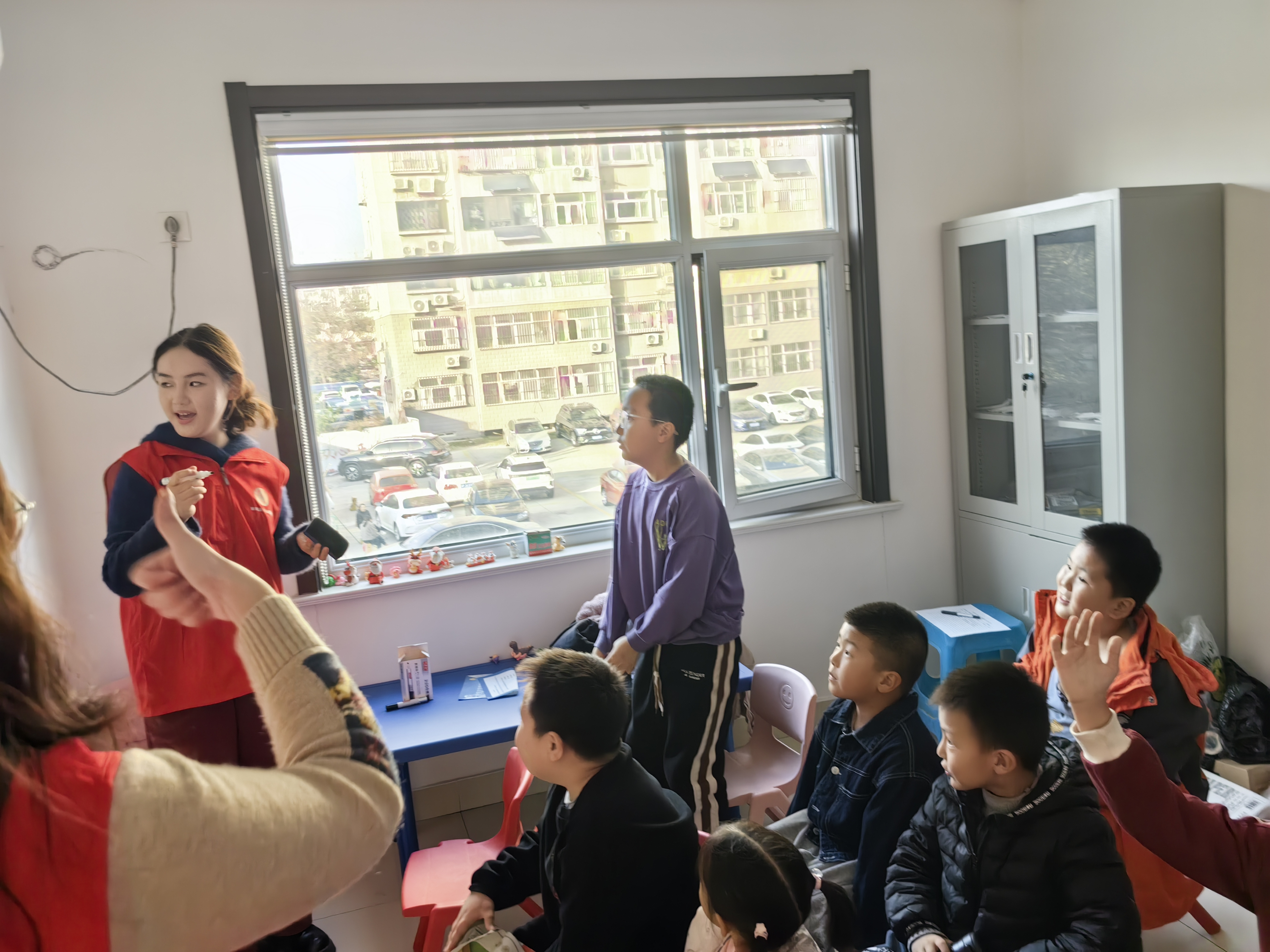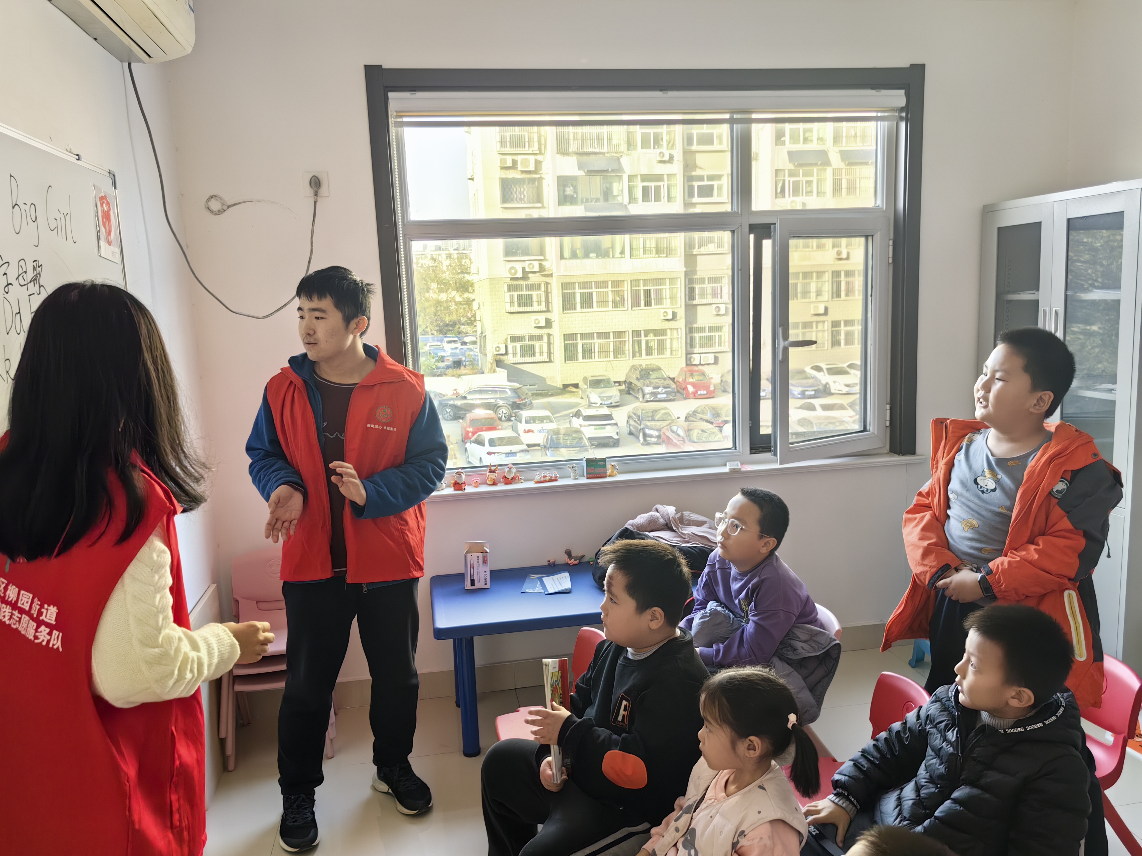 接着,志愿者组织小朋友们学唱简单英文歌曲《big big girl》,进行逐句讲解领唱,鼓励小朋友们积极唱歌,并纠正发音问题,调动小朋友们学习英语的积极性与主动性;
