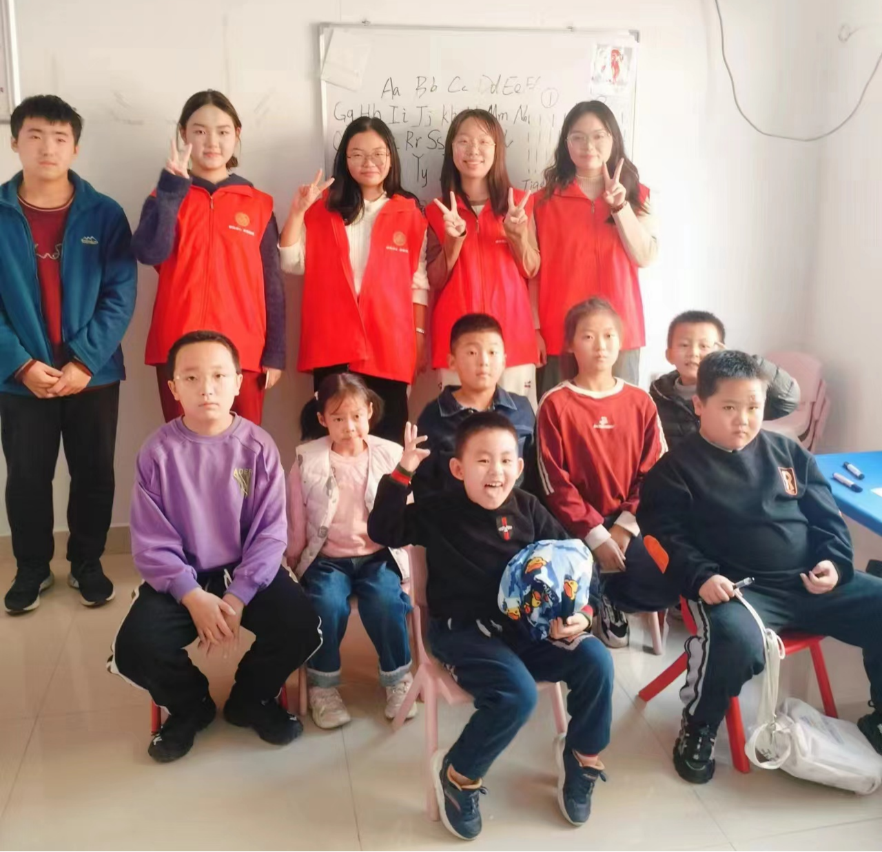 最后,志愿者组织小朋友们与志愿者交流英语学习上的问题,并合影留念。